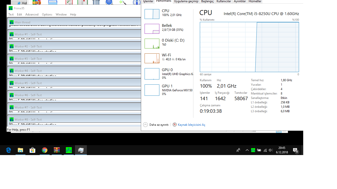 i5 8250U 1.58 GHz'de çalışıyor