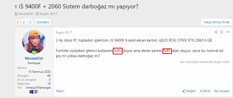 Fortnite RTX 2060'ı çok zorlayan bir oyun değil. CPU'ya daha çok yükleniyor belli ki. Arkadaş da ayarları düşürüp oynadığını belirtmiş. Burada sorun kullanım yüzdeleri değil. Aldığı performans normal gözüküyor. Sorun takılma. Ben de diskten kaynaklı olabileceğinden belirttim. @arthurmorgannn Grafik sürücüsü güncel midir bu arada?