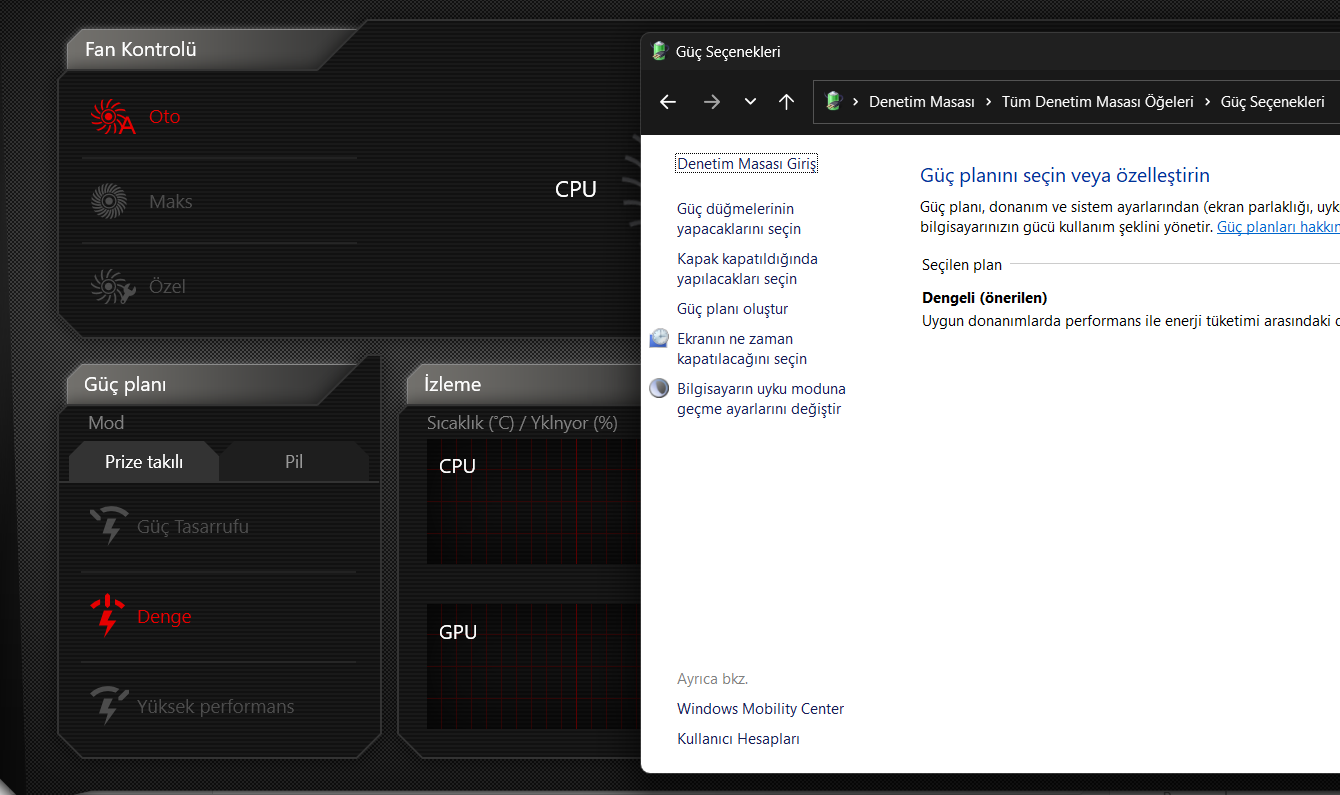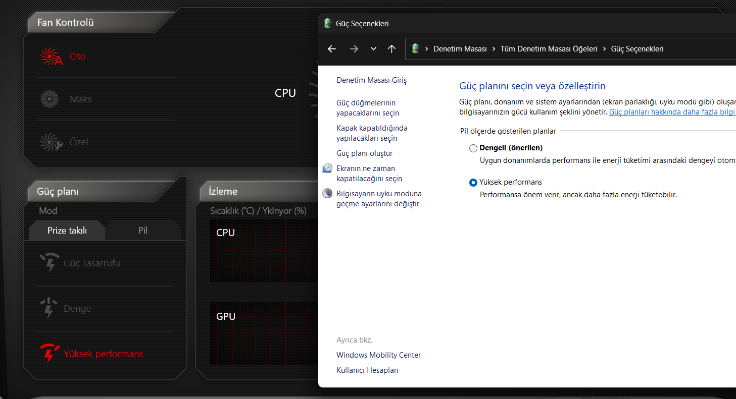 1: Kullandığınız kontrol yazılımı varsa oradaki güç profili değiştirildiğinde denetim masasındaki güç planları değişiyor mu? Eğer cevap evetse harika!(Aslında o kadar bir hayati öneme sahip değil sadece profil değiştirmek daha kolay olur, ama olmasa da olur.) Örnek görsellerdeki gibidir. Dediğim gibi olmasada olur.