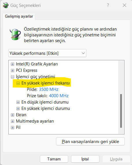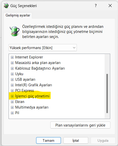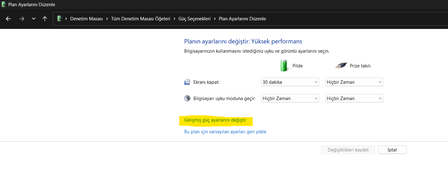 Yüksek performans modunu baz alalım.(Bütün güç profiller için aynı şeyi uygulayabilirsiniz.)