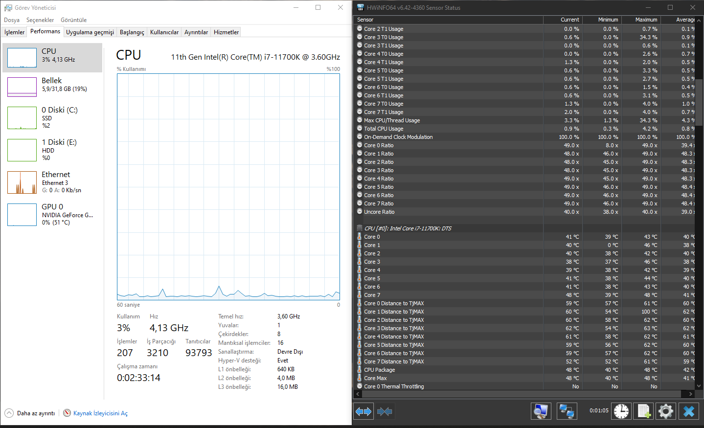 Intel Core i7-11700K işlemci sahibiyim. ASUS ROG STRIX Z590e Gaming Wi-Fi anakart ve Cooler Master Hyper 212X soğutucu kombinasyonu ile kullanıyorum. Kasa olarak ise 3 intake bir egzoz olmak üzere 4 fanlı Corsair Crystal 570X kullanıyorum.