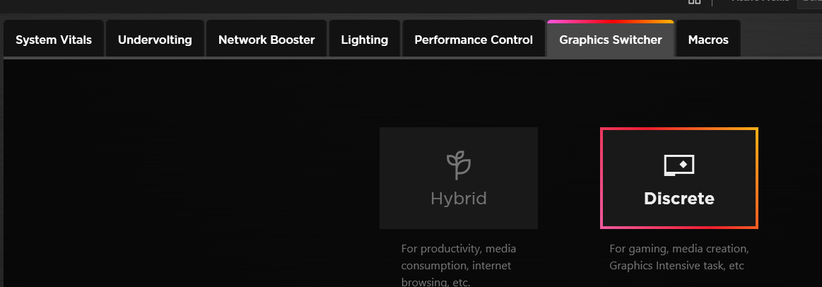 Yanılmıyorsam Dynamic Boost 2.0 halihazırda olan bir şey olduğundan sonradan etkinleştirilebilen bir ayar değil. MUX Switch kapalı olması için yanılmıyorsam hybrid moduna almam gerekecek. Yanlışsam düzeltin. (hybrid modunda GPU kullanılmadığı sürece kapalı kalıyor.)