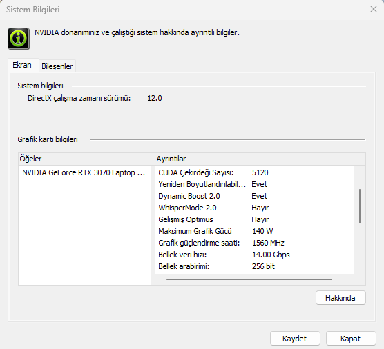 Bu arada NVIDIA Denetim Masası'ndan sistem bilgisine baktığımda 140W yazıyor Max. Güç için.