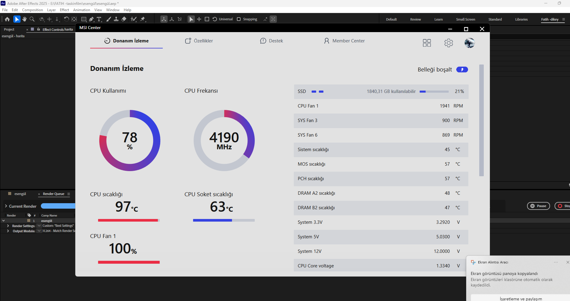 Selamlar dostlar. Ben videographer bir kardeşinizim. Kısa süre önce 2. el olarak yazılımcı bir arkadaştan bir sistem satın aldım. After Effects'i çok yoğun kullanan bir videographer'ım ben ve işlemcim çalışırken ve render alma sırasında ara ara çok yüksek sıcaklıklara çıkıyor. Görselini ekledim. En fazla 1-2 dakika bu sıcaklıklarda geziyor, sonra düşüyor geri çıkıyor vs. böyle bir problemim var, sizce sorun mu var normal mi?