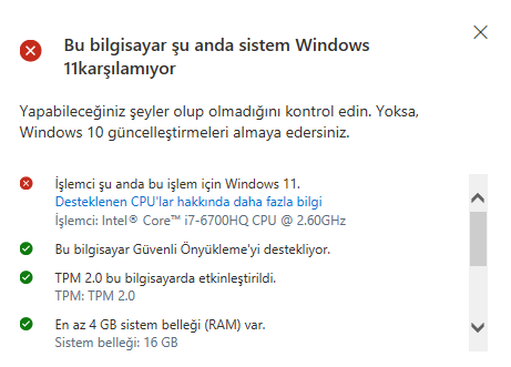 Yuklersin, gayet de kaldirir. 7200U da kaldirdi. Windows'un sacma islemci sorununa bakma.Merhabalar. Windows 10 kullanıyordum ve bundan sıkıldım ve 11'e geçeyim diye düşündüm. PC sistem durumunu kontrol ettim. Sadece işlemcim kötü. Geçme yolu var mıdır?