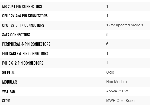 Hocam ilk gönderide bahsettiğiniz MWE Gold 750 güç kaynağının PIN'lerine baktım. PCI-E için 4 adet 6+2 PIN giriş bulunmakta işlemci tarafında ise 1x4+4 ve 1x8 (güncellenmiş modeller için) PIN CPU girişi bulunmakta. Şöyle paylaşayım faydalı olur umarım.