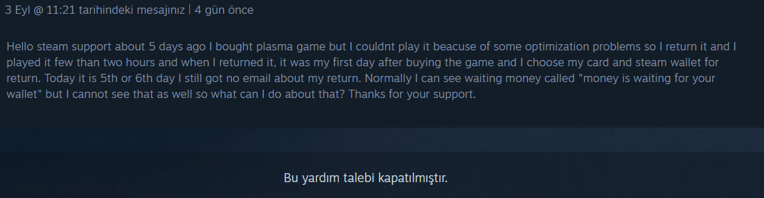 Arkadaşlar yaklaşık 1 hafta önce Steam'de 24 TL'ye plasma oyununu satın aldım (4 TL karttan 20 TL Steam cüzdanı olarak) ancak beğenmedim ve kart ve Steam cüzdanım için iade ettim ancak halen talep onaylanmadı ve ayrıca eskiden oyun iade ettiğimde cüzdanda bekleyen para miktarı gözükürdü ancak oyunu iade ettiğimde göremedim (bundan dolayı da şüphelendim ve birkaç kez iade talebinde bulundum 4 kez falan) en sonunda destekle iletişime geçtim ve iade durumunu anlattım ancak Steam desteğe yazdığım kutuma baktığımda bu yardım talebi kapatılmıştır yazıyordu oysaki gayet açık (anlaşılır) ve argosuz bir dille yazmıştım. (İngilizce) Bu duruma internetten baktım sebebini ve desteğe attığım mesajı