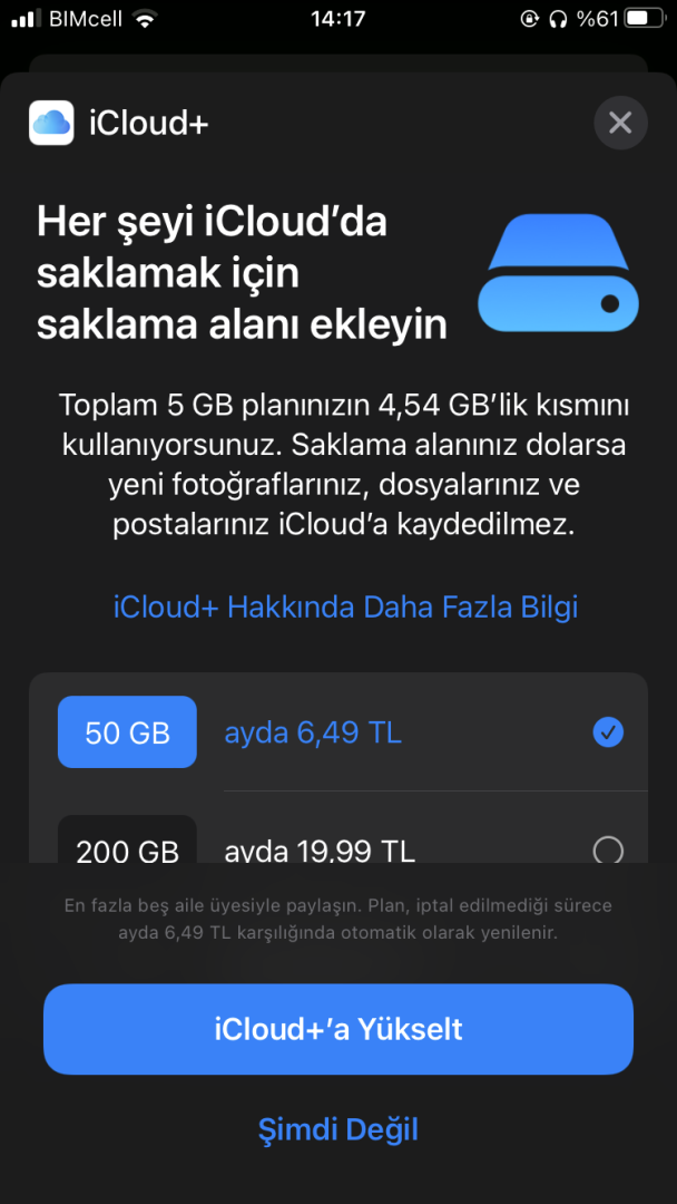 Uyarıyı almak istemiyorsanız İcloud yedeklemesini kapatabilirsiniz.