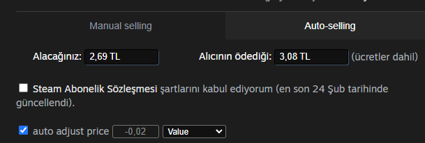 Büyük ihtimal yüklüdür ama yüklü değilse tarayıcınıza Steam Inventory Helper ekleyin. Envanterinizden satacağınız kartları seçtikten sonra “GO TO SALE” kısmına girip burayı böyle ayarlayın: