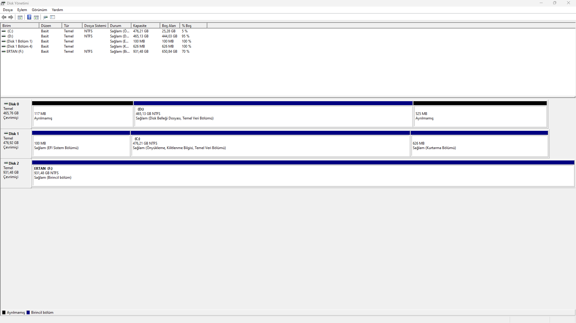 Diğer birimleri sildim. Sanırsam yanlış bir işlem yaptım ve o kısımlar ayrılmamış kısım olarak gözüküyor ve 465 GB içerisinde içinde bir şey kurulu olmamasına rağmen 444 GB boş gözüküyor.