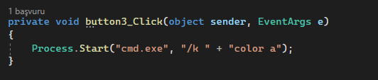 Bu kod, CMD'yi açar ve yazı rengini yeşil yapar.