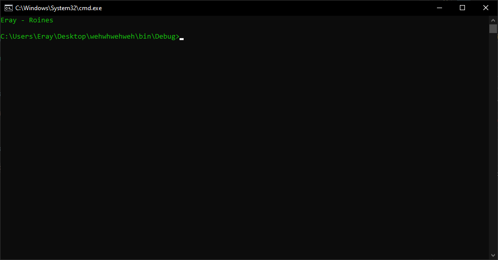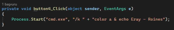 Bu kod, CMD'yi açar ve ardından yazı rengini yeşil yapıp ekrana Eray - Roines yazar.