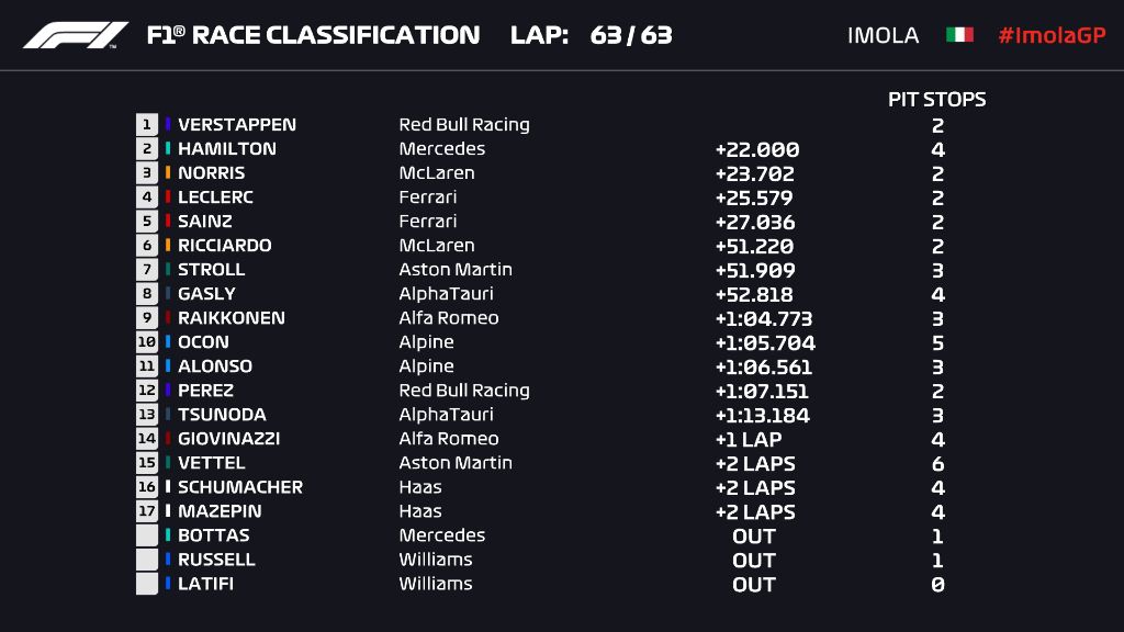 Redbull: Verstappen startta liderliği aldı, sonradan yağmurda çok hızlıydı, Hamilton ile mücadelesinde Hamilton'un aracından bir parça koptu ön kanat noktasından. Yarış durdurulduktan sonra yeniden başladığında Norris'ten kurtulmak Verstappen için sorun olmadı ve rahat bir galibiyet aldı.