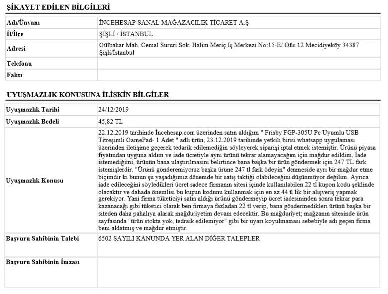 Malum sitede 22 TL kuponum vardı, kuponu kullanmak için en az 44 TL harcamak gerekiyor. Bende 27 TL'ye gamepad yanına da 44'e tamamlansın diye 35 TL'ye SD kart aldım. Ertesi gün WhatsApp'tan yazdılar gamepad tedarikciden tedarik edilemiyormuş. Hemen parayı iade etmeye çalıştılar. İadeyi de kupon olarak geri yükleyeceklermiş ki o kuponu kullanmak için tekrar en az 44 TL alışveriş yapmam gerekiyor. Sürekli siparişi iptal etmemi istediler, bende iptal etmeyeceğimi ürünün tarafıma ulaştırılmasını istediğimi söyledim. Bana siteden başka bir ürün seçin dediler bende herhalde mağduriyeti gidermek için yollayacaklar sandım. Kategoride sadece bir tane gamepad vardı (benim aldığımı hemen kaldırmışlar stokta yok diye) oda Logitech F370 ve 274 TL. Sadece o var diye modelin ismini söyledim ve benden 247 TL fark istediler. Vay anasını dolandırıclıkta yeni bir çığır açmışlar. Ki farkı vermezsen bile yine kupon olarak iade edecekleri için o kuponu kullanmak için en az kuponun 2 katı kadar alışveriş yapman gerekiyor. Sonuçta her türlü kazanıyorlar ama tüketici olarak benim mağduriyetimi gidermeye çalışmıyorlar. Bir de bunların üstüne sipariş iptalini kabul etmem için "mağdur olmamanız için paranızı iade edeceğiz" diyorlar şaka gibi yok bir de etmeyin! Gerçi bana demişlerdi eski batan Gold bilgisayarın yenisi, o siteye bulaşma ben çok sorun yaşadım diye. Ama küçük ürün diye bir şey olmaz dedim ama küçük müçük bunu 10 kişiye yapsalar sürekli fena para kırarlar. Sonuç olarak tüketici hakem heyetine başvurdum.