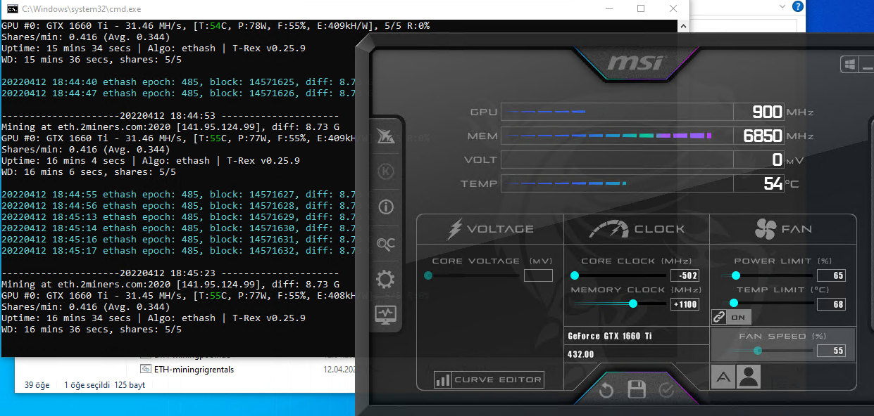 Hocam bende de Micro çipli 1660 Ti var ancak en fazla 31.07 mh alıyorum. +1140 Memory -502 Core clock 65 Power. Bu ayarları deneyin hocam kaç alacaksınız acaba?