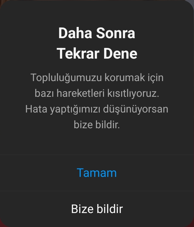 Dostlar selam, Instagram'da herhangi bir şeye beğeni atıyorum ama hemen Instagram beğenimi geri çekip bana bu uyarıyı yapıyor, yaklaşık 3 haftadır bu sorun canımdan bezdirdi. Çözümü bilen arkadaşlar yardımcı olursa sevinirim.