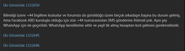 Bilindiği üzere +44 İngiltere kodudur ve forumda da görüldüğü üzere birçok arkadaşın başına bu durum gelmiş. Ama Facebook ABD kuruluşlu olduğu için size +44 numarasından SMS gönderme ihtimali yok. Aynı şey WhatsApp için de geçerlidir. WhatsApp kendilerine aittir ve yeşil tik almış hesaptan kod gelmesi gerekmektedir.