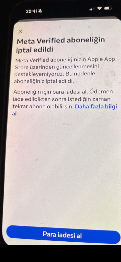 Benim Instagram'da satış yaptığım için mavi tikim vardı. Ancak 1 ay önce Apple kimliğimle ilgili bir sorun oldu ve düzeltmeme rağmen her ay ücreti aldıktan sonra böyle bir uyarı alıyorum. Para iadesi al butonuna basınca para iadesi devam ediyor ekranında kalıyor. Bunun herhangi bir çözümü var mı?