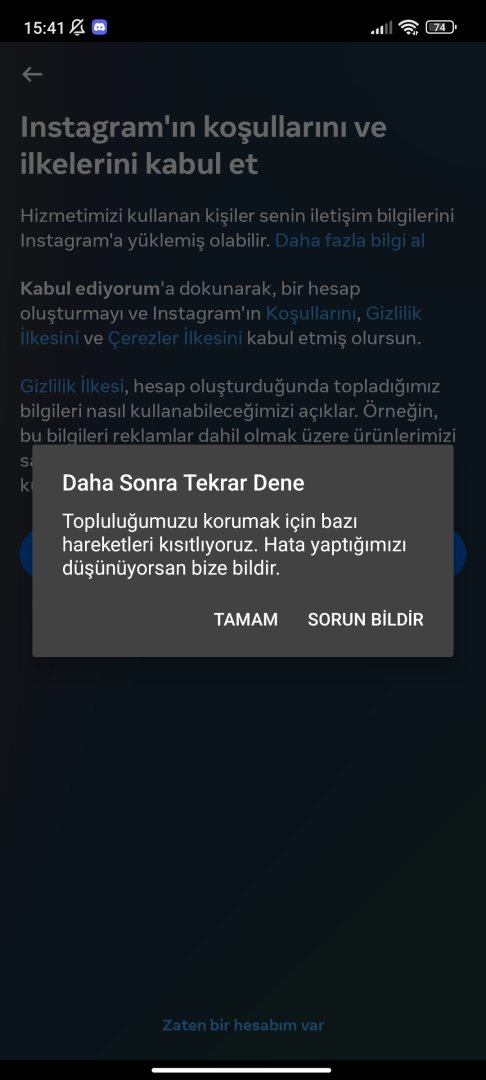 Instagram'da yeni hesap açarken "daha sonra tekrar dene" hatası