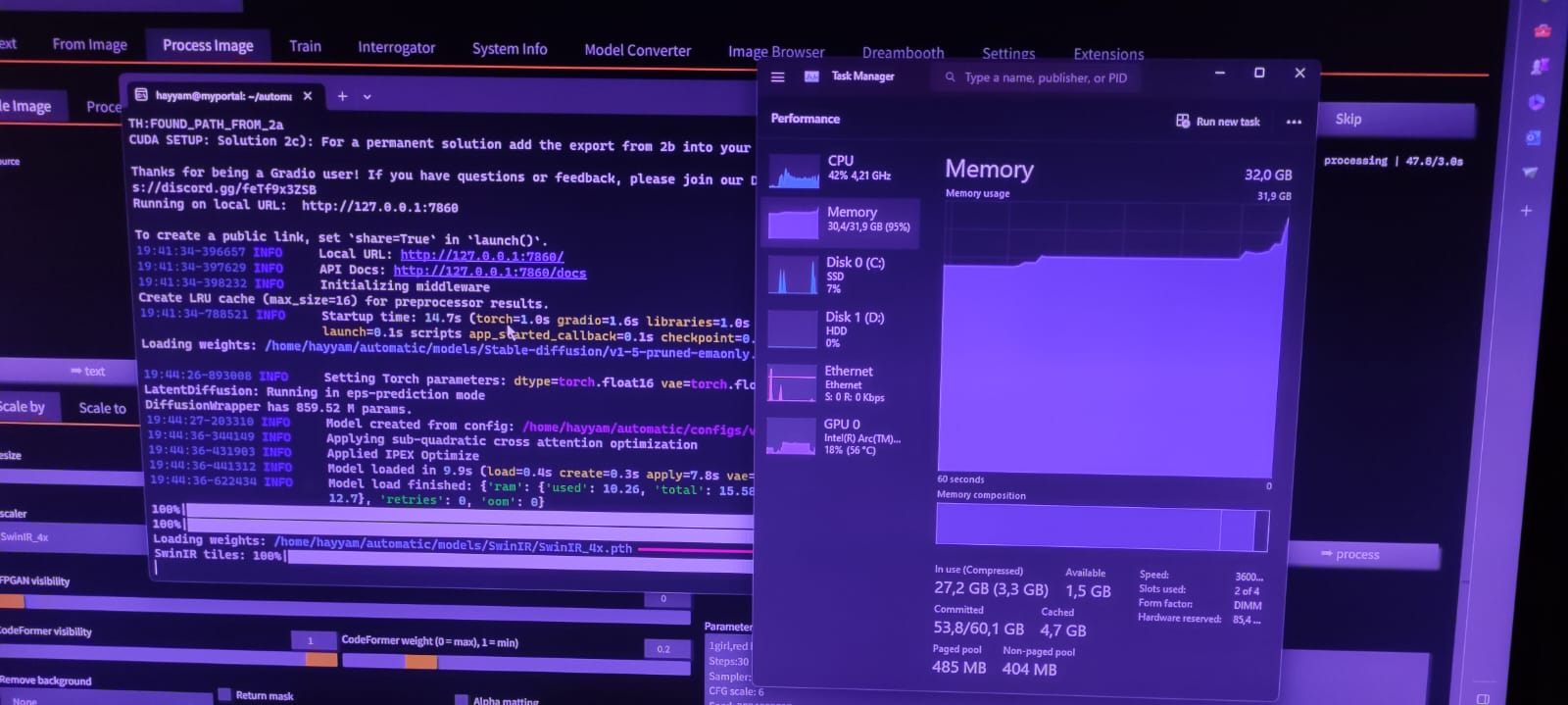 --Use-ipexi ekliyorum her seferinde. Dediğiniz Patch'i uygulamayı beceremedim. Bash komutuna cevap olarak oneapi set olmadi diyor. Set ediyorum ama hala aynı cevabı veriyor. Uğraşmayı bıraktım bir kez daha resim üretmeyi denedim. Img2Img'da daha 2 katına scale ederken mavi ekran hatası verdi yine. Bu işte bir anormallik var. Mesela hiçbir işlem yapmiyorken sadece Stable Diffusion açık ve boşta bekliyorken 21GB civarı RAM kullanımda görünüyor. Bu normal mi bilmiyorum ama normal olmamalı herhalde. 16 GB VRAM'in de 15 GB'ı dedicated olarak gözüküyor görev yöneticisinde. Bunlar normal mi bilgim yok.