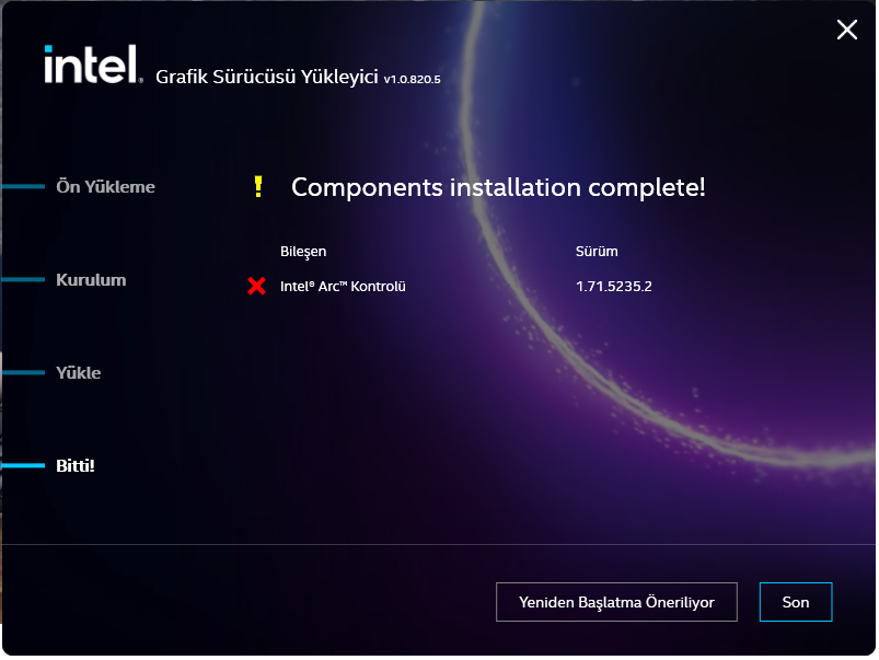 Intel Arc A750 8 GB ekran kartını aldım. Driverını kuruyorum driver kuruluyor ama kontrolcü yüklenmiyor. Sadece kontrolcüyü yüklemeye çalıştığım zaman da olmuyor.