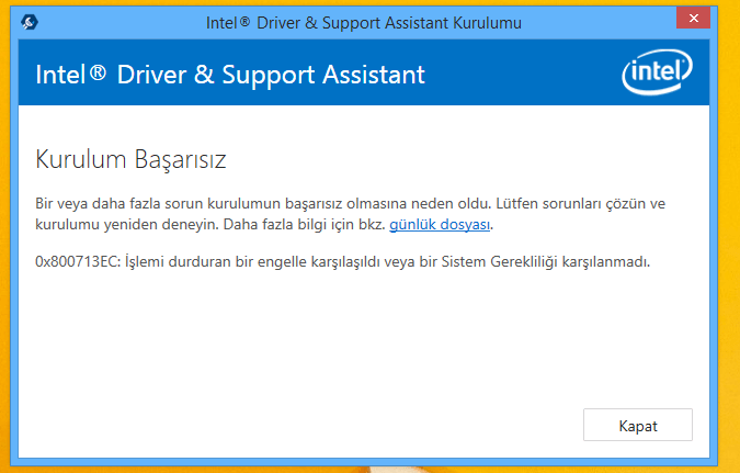 Intel Driver and Support Assistant uygulamasını kurarken başlıktaki hatayı alıyorum. Görüntüyü de koyacağım.