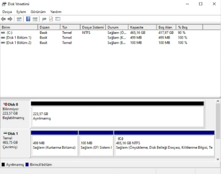 Başlatman lazım. Zaten Disk Yönetimi'ne girdiğinde direkt sana soruyor, bu disk başlatılmamış diye? MBR veya GPT olarak bölümledikten sonra çalışması gerek.