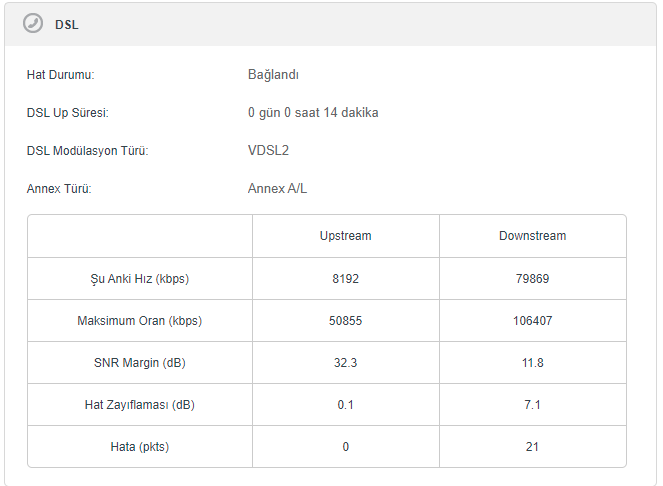 2 ay öncesine kadar bölgemizde ADSL altyapı vardı. Yılbaşında sokakların bulunduğu Ana caddede bulunan Türk Telekom kutularını yeni tip kutular ile değiştirdiler. Hepsinden fiber geçti ve böylece bölgemize VDSL açılmış oldu. Bunu dört gözle beklerken, 3 hafta önce altyapı çalışmalarını bitirdiler. Altyapı sorgulamalarında boş port olduğunu ve santrale 180 metre mesafede olduğum gözüküyor. Netspeed firmasını tercih ettim ISS olarak. Aslında düzgün gelen bağlantımda kendileri ile hiçbir problemim yok. Fakat özellikle son bir haftadır, özellikle akşam 20:00'den itibaren sık sık kopmalar yaşıyorum, anlık olarak gidiyor ve 1 dakika içerisinde tekrar geliyor. Fakat bu gündüz saatlerinde de geçerli, akşam saatlerinde hissedilecek seviyede artıyor. Modem ara yüzünde bağlanıyor olarak gösteriyor.