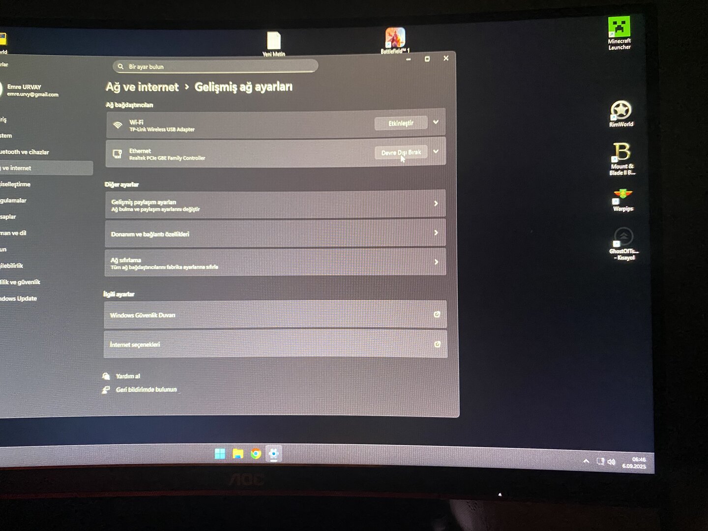 İnterneti görseldeki gibi etkinleştiriyorum. Ethernet simgesi aşağıda 2-3 sn yanıp sönüyor ve yine devre dışı kalıyor Wi-Fi adaptörü takıp bağlanmayı denediğimde de aynı şekilde Wi-Fi 2-3 sn yanıp sönüp internet yok durumuna geliyor. Her şey normalken bir gün PC'yi açtığımda bu halde internetim yoktu. Diğer aygıtlardan modem Wi-Fi ına bağlantım var. Yardımınızı bekliyorum.