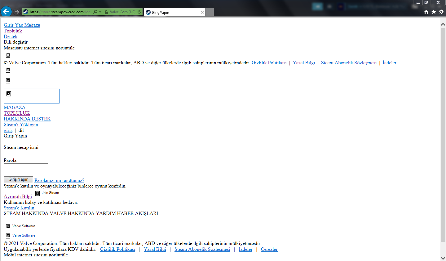 Internet Explorer tarayıcıdan Steam'e giriş yapamıyorum. Bu şekilde gözüküyor.