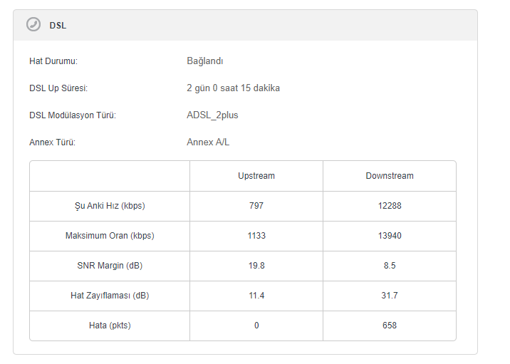 Mesela sizin hızınız 16 Mbps ise hat 14 Mbps verirse anlık kopmalar veya 15 dakika gibi aralar ile kopmalar olabilir, bu hat ile kaynaklıdır hız değerlerinizi arayüzden atmanız lazım.