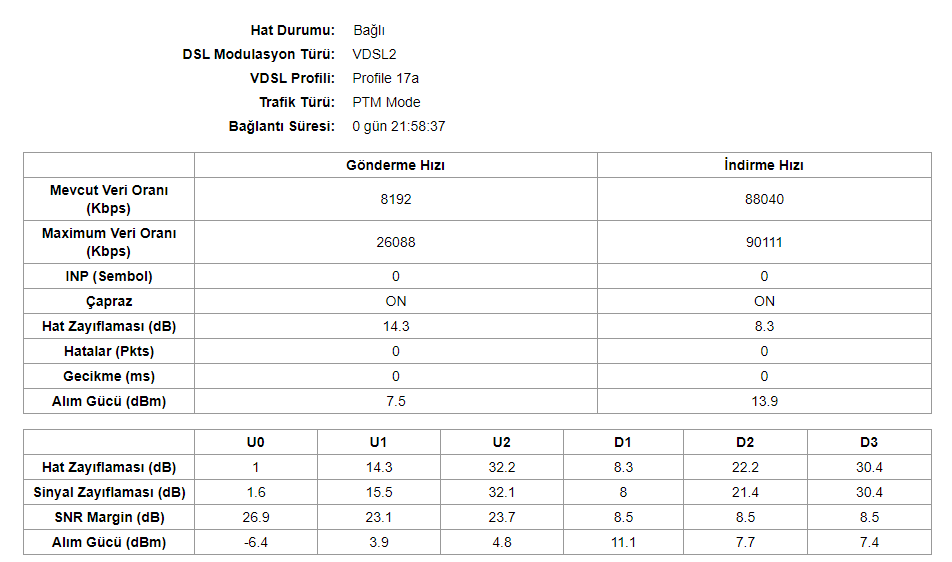 Merhaba arkadaşlar. TürkNet kullanıcısıyım. Önceden 35'e 6 olan paketibi kullanıyordum. 1 hafta önce bir üst pakete 10TL fark ile geçiş yaptım. Geçmeden önce de görüşmelerimde maksimum altyapımım 88 desteklediğini söylediler. Şimdi ise TürkNet oım'den kontrol ettiğimde 88'e 8 gönderiyorlar. Aynı şekilde modem arayüzümden de kontrol ettiğimde bu hızı alıyorum. Fakat hız testi yaptığımda hâlen eski hızımı alıyorum 1 gıdım dahi oynama olmadı. Modemim ASUS DSL AC51 (şu anda denemek için TP-Link'in VDSL2 modemini kullanıyorum), farklı modem ile denedim, farklı telefonlarla bilgisayarlarla denedim, çerezleri temizleyip denedim değişen bir şey olmadı. Hız geliyor gözüküyor tamam ama hız testinde eski hızımın aynısını alıyorum. Hat değerlerimi aşağıda paylaştım şu anda 50Mbps hız alan arkadaşım ile neredeyse aynı değerler mevcut. Diyelim ki altyapı için yanlış söylediler fakat 88Mbps dowloand gönderiliyorsa en azından 1Mbps dowloand artardı 33 ise 34 olurdu o da olmadı. Artık bir seçenek kalmadı çok saçma geliyor. Sizce nereyi atlıyorum yardımınıza ihtiyacım var. Şimdiden yardımcı olmak isteyen herkese teşekkür ediyorum.