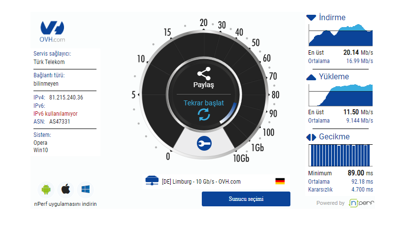 Speedtest üzerinden yapılan hiç bir teste güvenilmez. 2024'te artık bunu anlamak gerekiyor. idm (internet download manager) ile şu; Speedtest || iperf by OVHCloud En alttaki 10 gio file dosyasını indirirken ss at. Kaç MB/s de indiriyorsun onu göreyim bi