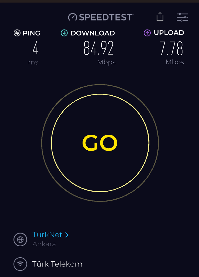 Wi-Fi ile bağlandım. Bana iyi gibi geldi. Paket 100Mbps. Normalde altyapım Max 77 veriyordu fakat 100 Mbps'nin 85-90 Mbps'sini alıyorum.