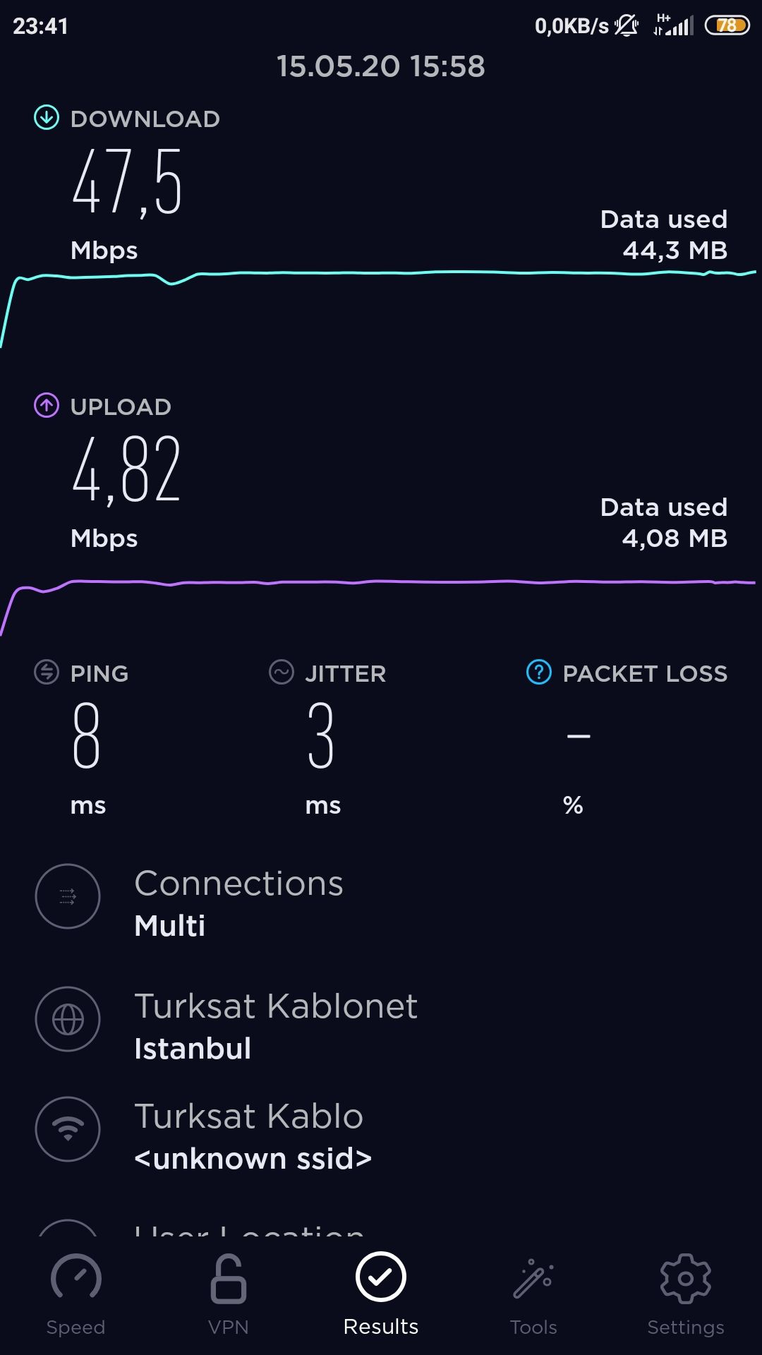 Şuan memleketimdeyim fakat virüs zamanı yaptığım bir test buldum. Yani herkesin evinde olduğu sıralar. Konum: İstanbul Screenshot_2020-08-10-23-41-28-233_org.zwanoo.android.speedtest.jpg
