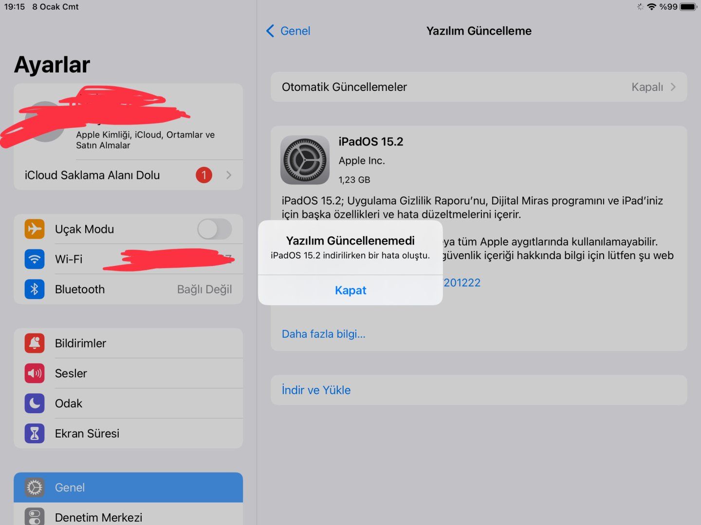 iPadOS 15.2'yi indiriyorum ve güncelleye basıp şifreyi giriyorum fakat yaklaşık 10 saniye sonra hata veriyor ve indirilen yazılımı siliyor. Sorunu nasıl çözebilirim?