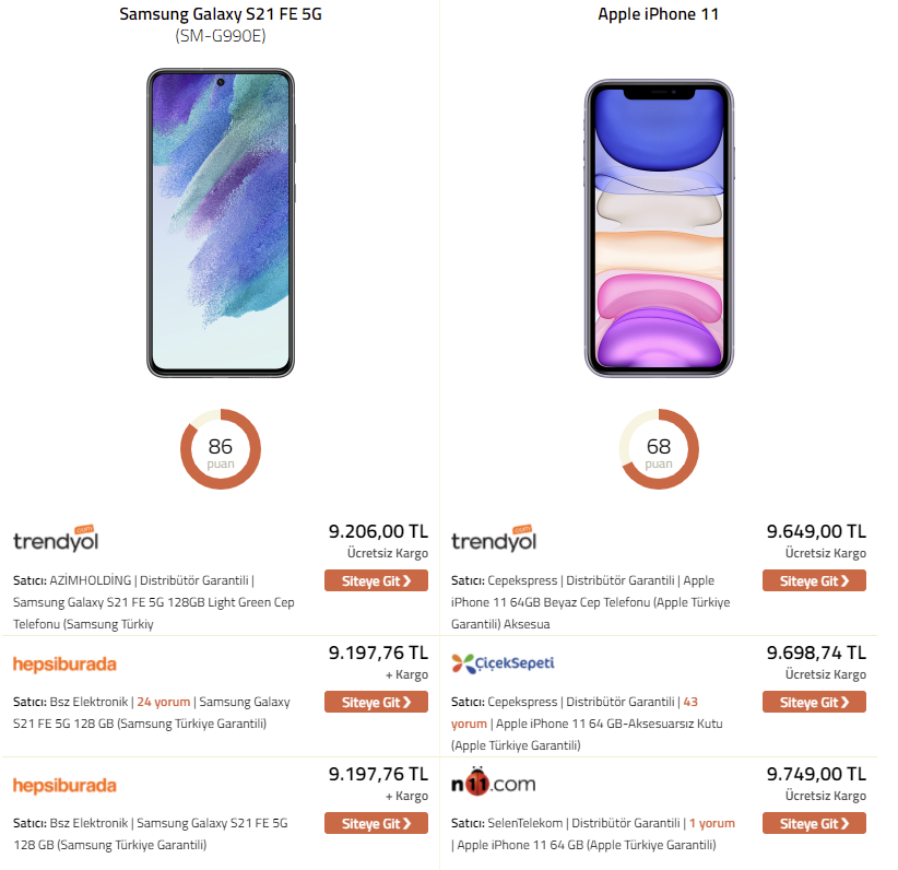 Karşılaştırma Linki: https://www.epey.com/akilli-telefon...682384/apple-iphone-11_samsung-galaxy-s21-fe/