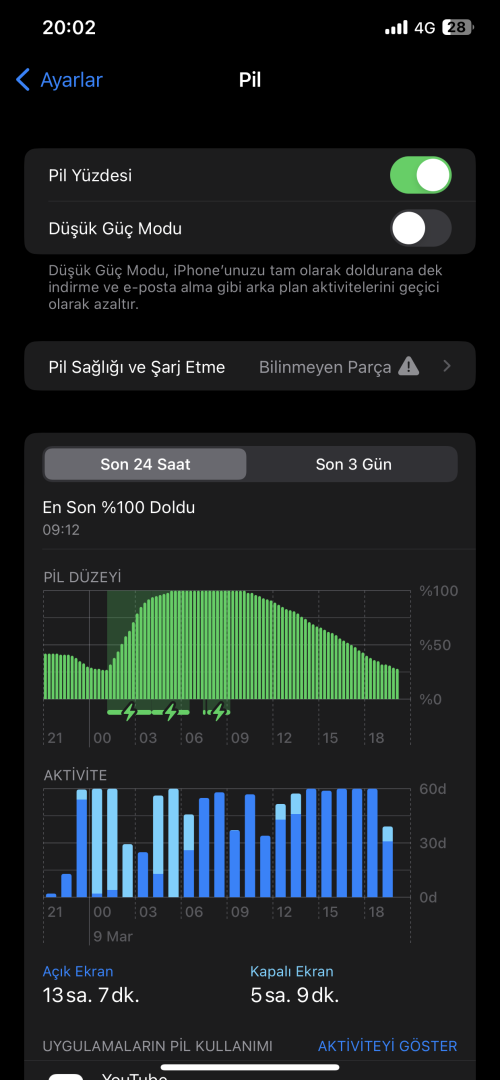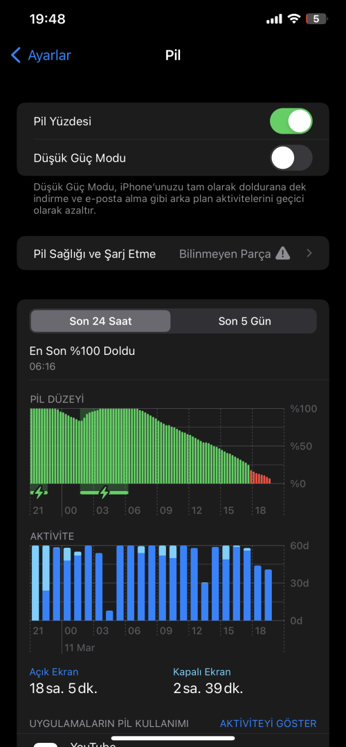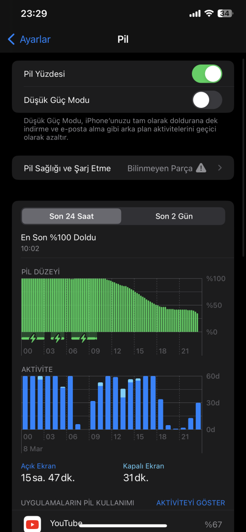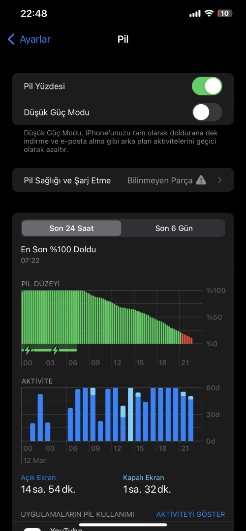 Daha sonra ekstra işlem yaptırılırsa bilinmeyen parça uyarısı vermez ve pil sağlığı yazar