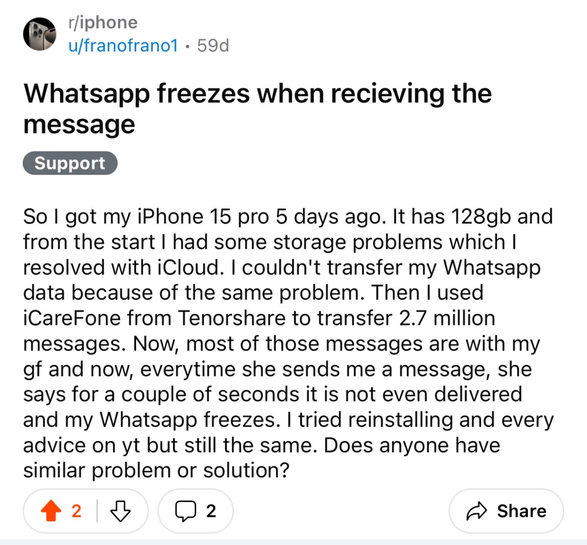 Arkadaşlar merhaba. POCO X3'ten iPhone 11 Pro Max'e geçtim. Her şey iyi güzel fakat WhatsApp'da sohbetteyken mesaj geldiğinde halihazırda ben de mesaj yazıyorsam veya da ses kaydediyorsam telefon 1-2 saniyeliğine donuyor. Canımı sıkmamaya çalışıyorum fakat gerçekten gün geçtikçe daha çok sinirimi bozuyor.