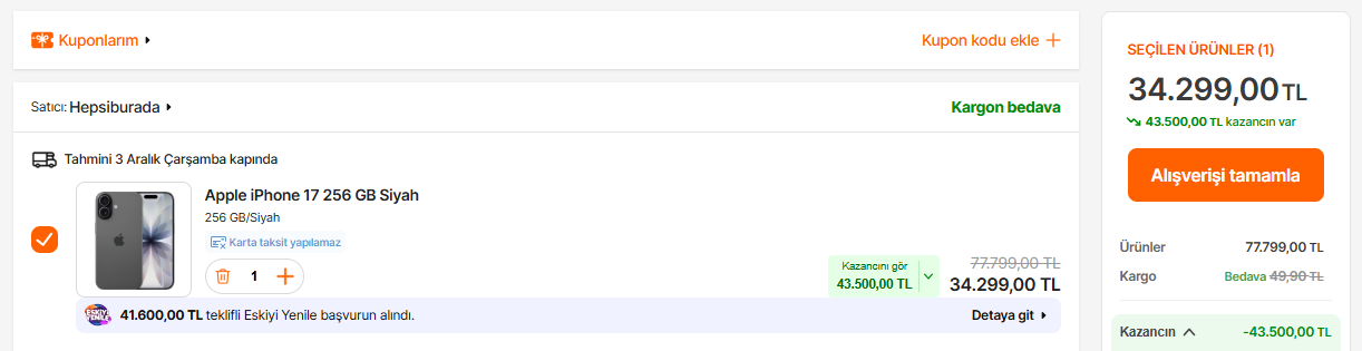 Hepsiburada'da eskiyi yenile kampanyası ile iPhone 17 34.299 TL'ye denk geliyor. iPhone 15'ten pek memnun değildim ama bu paraları vermek de şu an benim için zor, yeni bedelli askerlik ödedim çünkü