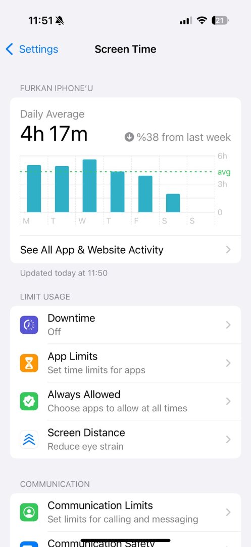 Merhaba arkadaşlar, yaklaşık bir ay önce Samsung marka cihazımdan iPhone 16 Pro'ya geçiş yaptım. Telefon hakkında çok fazla bilgi sahibi değilim ancak Samsung sonrası pilin çok hızlı bittiğini fark ettim. Kullanım verilerimi ekran görüntüleriyle paylaştım, bu değerlerin normal olup olmadığını merak ediyorum. Bir not olarak, WhatsApp üzerinden görüntülü konuşmalar yapıyorum, genellikle gün içinde toplam 30 dakika ile 3 saat arasında tutuyor. Cevaplarınız için şimdiden teşekkürler. Ayrıyeten telefonu %20 ila %100 seviyeleri arasında kullanıyorum.