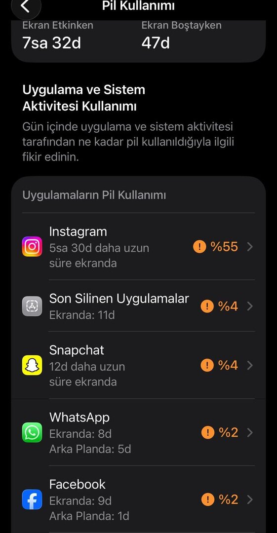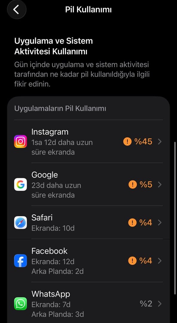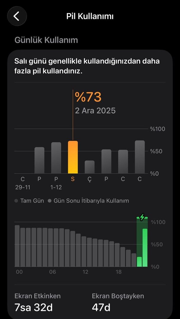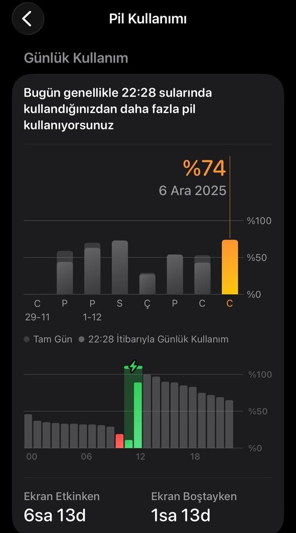 Telefonu pazar günü aldık. Sonuçlar ne kadar sağlıklı olur bilmiyorum fakat İOS 26.1'e geçmeden önce hızlı gittiğine şahit oldum. Geçtikten sonra da yeni bir telefona göre yine hızlı gittiğine de şahit oldum kısa bir süreliğine. Kullanan kişi biraz düzeldi diyor fakat hala hızlı gittiğini söylüyor. Süreyi de doğru yerinden mi attım emin değilim, ara yüz değişmiş.