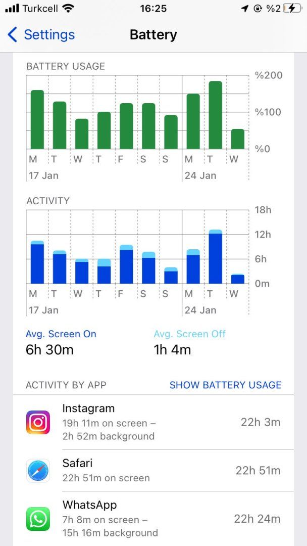 1 günü çıkarıyor mu normal kullanımda hocam? Çünkü şu an 2 saattir açık telefon, %100 den %69 a düştü maksimum 20 dakika sosyal medyada gezinmişimdir.Evet Deji kullanıyorum. Genelde şarjımı %250 civarlarında kullanıyorum.