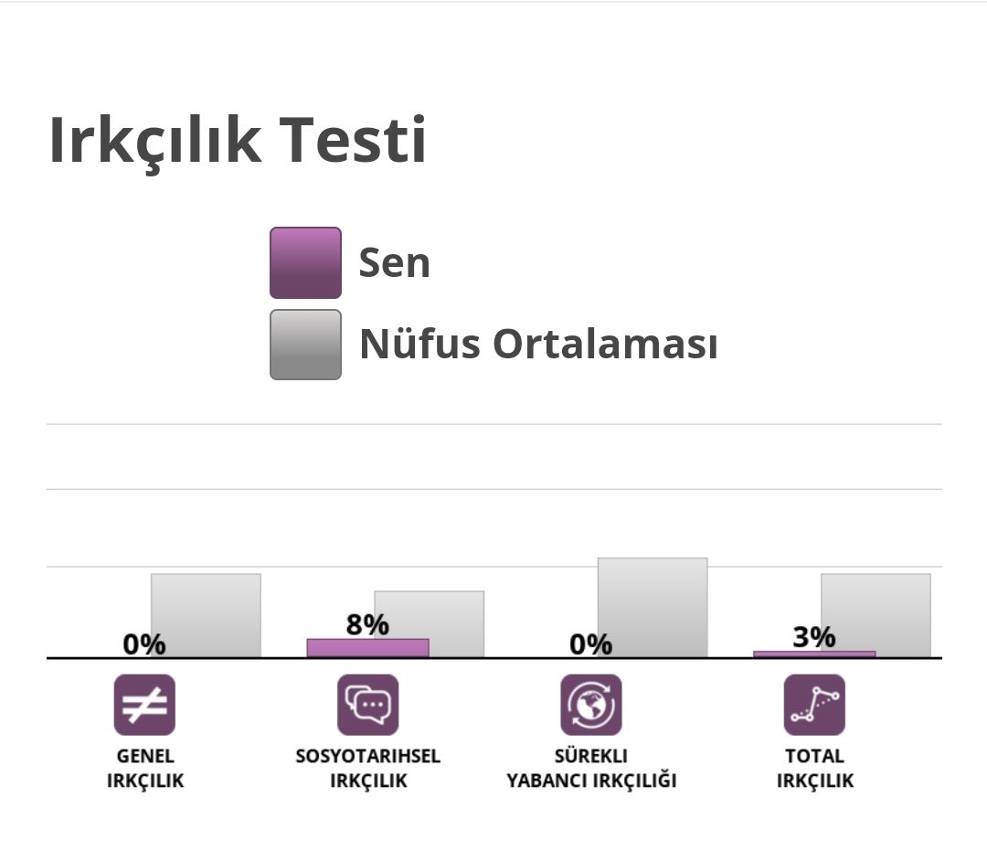 Ahah bu ırkçılık değil politik doğruculuk testi olmuş. Bile isteye farklı cevap verdiğim bir soru ile %3 ırkçı çıkarmış beni de.