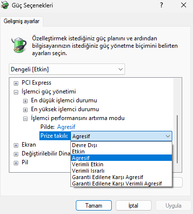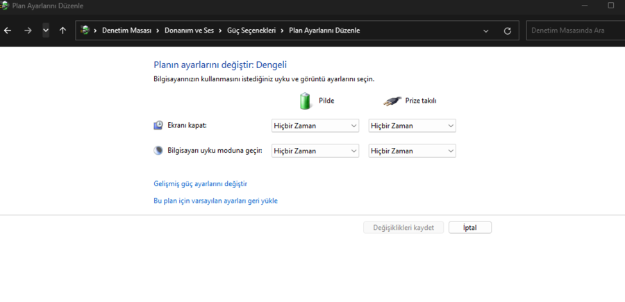 Şimdi hangi güç modunu kullanıyorsanız onun ayarlarına gelelim.