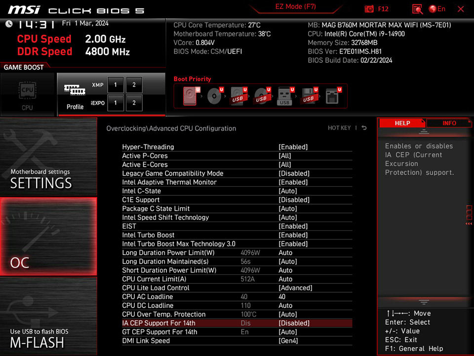 "Intel mikro kodunu 0x123 sürümüne güncelleyerek Intel 14. nesil k serisi olmayan işlemcilerde daha iyi performans için Cep'nin devre dışı bırakılmasına olanak sağlayın. Performansı artırmak için Cep'nin devre dışı bırakılması, güç tüketiminin ve sıcaklığın artmasına neden olabilir? Yeterli CPU soğutmasını sağlayın veya daha yüksek özellikli bir soğutma çözümü kullanın. Intel cep işlevi CPU modeline göre değişir. Ayrıntılar için Intel teknik özellikler sayfasına bakın veya teknik destekle iletişime geçin. Bu BIOS'un güncellenmesi, ilgili Intel ME'yi aynı anda 16.1.30.2307v4 sürümüne güncelleyecektir. Bu BIOS'u güncelledikten sonra, daha sonra eski bir BIOS'a geri dönseniz bile me sürümünün güncellenmiş sürüm olarak kalacağını unutmayın."