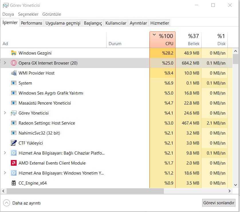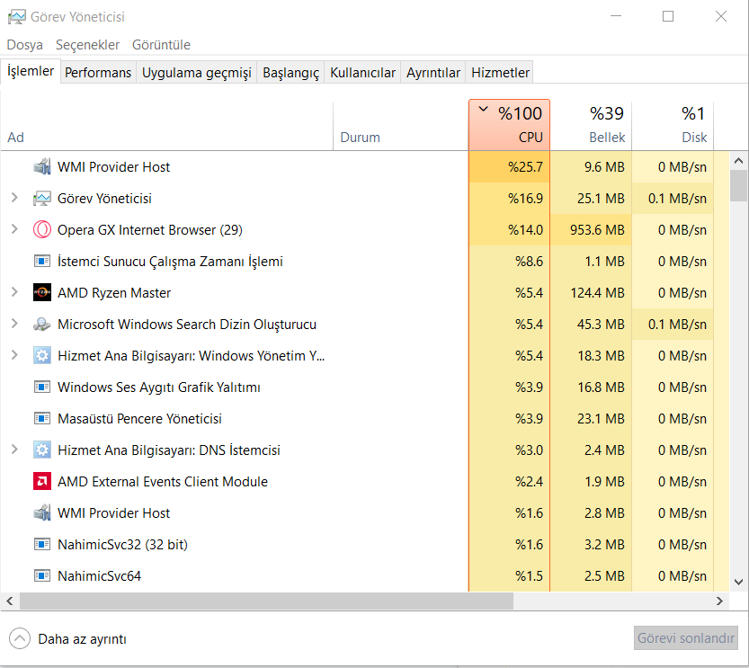 Bilgisayarım boşta beklerken dahi Görev Yöneticisi işlemci kullanımını %100 olarak gösteriyor.(kullanımı yüksek olan programlar düzensiz olarak değişiyor.)