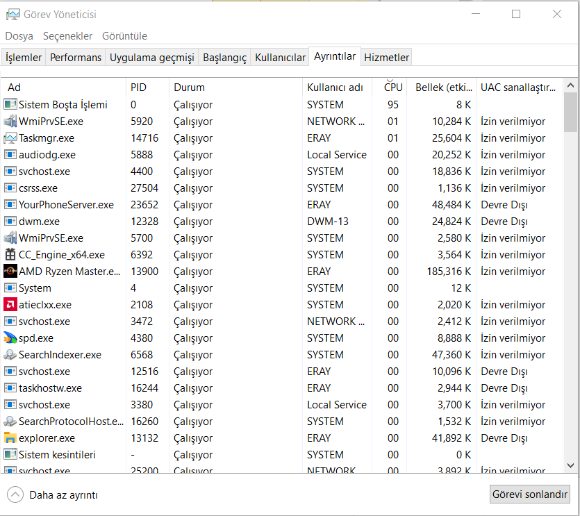 Görev Yöneticisi'ni ayrıntılar kısmında ise sistemin boşta olduğu gözüküyor.