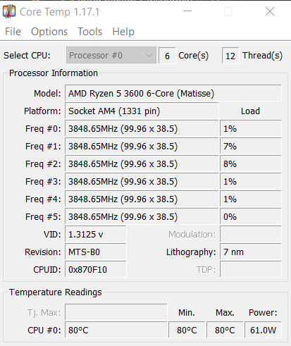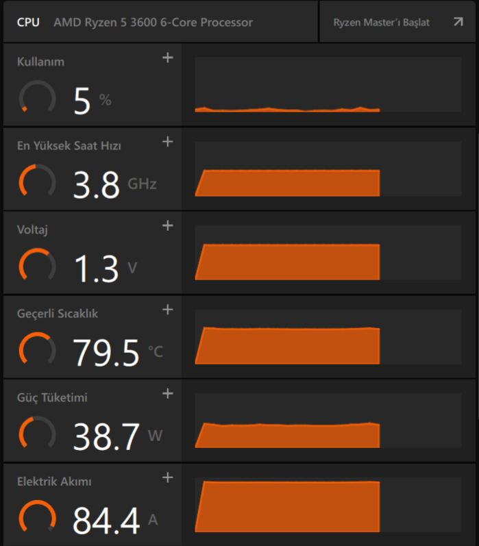 Görev Yöneticisi ve AMD Ryzen Master dışındaki diğer işlemci kullanımını gösteren programlarda herhangi bir yüksek kullanım gözükmüyor lakin işlemcinin sıcaklık değerlerinin yüksek olduğu gözüküyor.