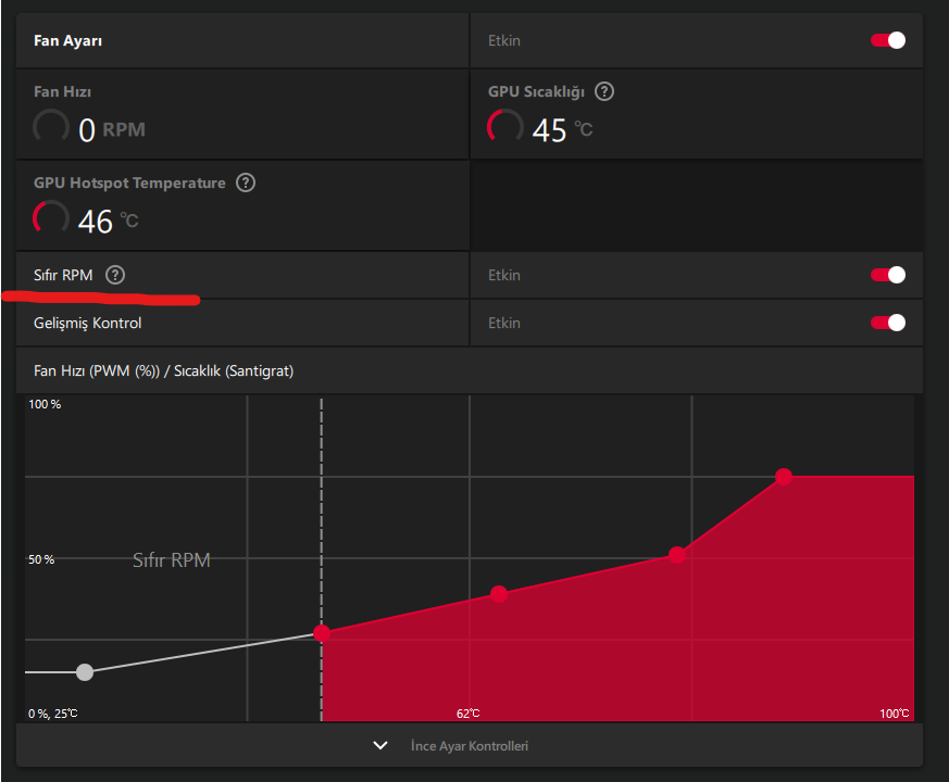 Manüel ayarlama seç. Fan ayarını aç. Sıfır RPM'i kapat. Ama yapmanı önermem. 50 derece serin sıcaklık. Fan dönmesine gerek yok. Oyuna girdiğinde kart ısındığında fan zaten dönecek.